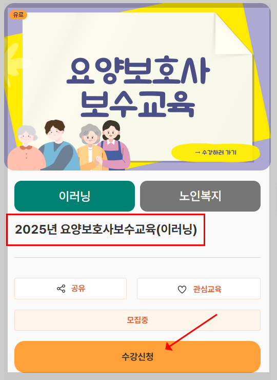 상단 메뉴에서 ‘교육과정 신청’을 선택하고, 요양보호사 보수교육을 입력 후 검색하면 ‘2025년 요양보호사 보수교육(이러닝)’ 과정이 보입니다.