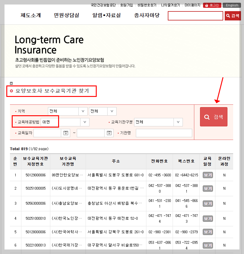 - [국민건강보험 홈페이지] 접속 → ‘요양보호사 보수교육기관 찾기’ 클릭